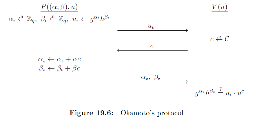 \[\begin{array}{rcl} g^{\alpha_z}h^{\beta_z} & = & g^{\alpha_t + \alpha c}h^{\beta_t + \beta c} \\ & = & g^{\alpha_t} h^{\beta_t} \cdot (g^\alpha h^\beta)^c \\ & = & u_t \cdot u^c \end{array}\]